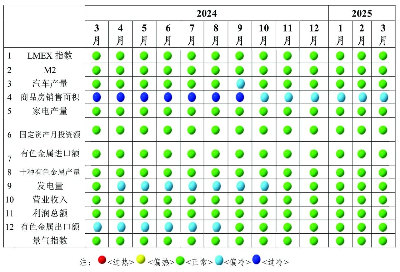 國際方面,3月份以來,全球經(jīng)濟呈現(xiàn)分化態(tài)勢,美國對非美經(jīng)濟體加征關(guān)稅的政策逐步落地,導致貿(mào)易摩擦升級,供應鏈成本上升,疊加地緣政治沖突,加劇滯脹風險。制造業(yè)與服務(wù)業(yè)表現(xiàn)分化,亞洲經(jīng)濟韌性較強,美洲制造業(yè)收縮,歐洲復蘇乏力。美國3月份制造業(yè)PMI減少1.3個百分點,降至49%,供需雙降,生產(chǎn)指數(shù)跌至48.3%,新訂單指數(shù)僅45.2%,滯脹壓力顯著;歐洲制造業(yè)PMI連續(xù)3個月回升至48.2%,但仍在收縮區(qū)間;新興市場局部亮點顯現(xiàn)。地緣政治及貿(mào)易摩擦不斷升級,3月份以來,美國總統(tǒng)特朗普相繼宣布對全球各國提高關(guān)稅;3月4日,美方以芬太尼為由對華加征10%關(guān)稅,疊加2月份措施后,部分商品總關(guān)稅達45%。中方迅速做出反制措施。3月28日,美方宣布,4月2日起對所有進口汽車加征25%永久關(guān)稅,中方訴諸WTO,進入4月份后,中美關(guān)稅沖突快速升級。 國內(nèi)經(jīng)濟方面,今年以來,國內(nèi)經(jīng)濟延續(xù)溫和復蘇態(tài)勢,制造業(yè)與非制造業(yè)協(xié)同擴張,但內(nèi)需修復基礎(chǔ)仍需鞏固。國家統(tǒng)計局發(fā)布的最新數(shù)據(jù)顯示,3月份,國內(nèi)綜合PMI產(chǎn)出指數(shù)為51.4%,連續(xù)兩個月高于榮枯線,制造業(yè)PMI升至50.5%(環(huán)比增長0.3%),非制造業(yè)商務(wù)活動指數(shù)為50.8%(環(huán)比增長0.4%),顯示生產(chǎn)與需求端同步改善。其中,制造業(yè)方面表現(xiàn)為以下特點:一是生產(chǎn)與需求協(xié)同增長,生產(chǎn)指數(shù)52.6%(連續(xù)5個月擴張),新訂單指數(shù)51.8%(環(huán)比增長0.7%),新出口訂單升至49%(環(huán)比增長0.4%),顯示內(nèi)外需同步修復;二是新質(zhì)生產(chǎn)力加速發(fā)展,裝備制造業(yè)、高技術(shù)制造業(yè)和消費品行業(yè)PMI分別為52.0%、52.3%和50.0%,比2月份分別上升1.2、1.4和0.1個百分點,景氣水平連續(xù)兩個月回升。受益于低空經(jīng)濟、“人工智能+”等政策支持,產(chǎn)業(yè)升級與技術(shù)創(chuàng)新驅(qū)動產(chǎn)能釋放。 產(chǎn)業(yè)方面,今年以來,有色金屬工業(yè)生產(chǎn)總體保持增長,固定資產(chǎn)投資增幅在兩位數(shù)以上;銅、鋁礦山原料進口量保持增長,未鍛軋鋁及鋁材出口下降;國內(nèi)市場銅、鋁、鉛、鋅價格上漲,工業(yè)硅、電池級碳酸鋰價格下跌;規(guī)模以上有色金屬工業(yè)效益比去年同期有較快增長。根據(jù)國家統(tǒng)計局統(tǒng)計, 1—2月份,規(guī)模以上有色金屬企業(yè)工業(yè)增加值比去年同期增長6.3%。其中,礦山采選企業(yè)工業(yè)增加值增長4.5%,冶煉加工企業(yè)工業(yè)增加值增長6.6%。1—2月,十種常用有色金屬產(chǎn)量為1293.9萬噸,比去年同期增長1.4%。其中,精煉銅產(chǎn)量為230.0萬噸,同比增長3.8%;原鋁產(chǎn)量為731.8萬噸,同比增長2.6%,占十種常用有色金屬產(chǎn)量的56.6%。6種精礦金屬量94.5萬噸,同比增長6.9%;氧化鋁產(chǎn)量1513.3萬噸,同比增長13.1%;銅材產(chǎn)量316.3萬噸,同比增長4.2%;鋁材產(chǎn)量967.4萬噸,同比增長3.6%。效益方面,規(guī)模以上有色金屬工業(yè)企業(yè)營業(yè)收入保持增長,實現(xiàn)利潤較2024年同期增長明顯。1—2月份,11890家規(guī)模以上有色金屬工業(yè)企業(yè)(包括獨立黃金企業(yè),下同)實現(xiàn)營業(yè)收入13434.5億元,比2024年同期增長21.3%;實現(xiàn)利潤總額526.8億元,同比增長32.0%,其中,獨立礦山企業(yè)實現(xiàn)利潤160.5億元,同比增長69.0%;冶煉企業(yè)實現(xiàn)利潤301.6億元,同比增長29.1%;加工企業(yè)實現(xiàn)利潤64.7億元,同比下降8.2%。 根據(jù)中國有色金屬工業(yè)協(xié)會最新發(fā)布的中國有色金屬企業(yè)信心指數(shù)報告,2025年一季度有色金屬企業(yè)信心指數(shù)為50.5,較2024年四季度上升1.0個百分點,高于臨界點50。一季度即期指數(shù)為49.6,較上季度回落0.3個百分點;預期指數(shù)為51.0,較2024年四季度增長1.8個百分點。這是該指數(shù)自2024年三季度以來的首次上升,尤其預期指數(shù)出現(xiàn)上升,表明盡管面臨諸多挑戰(zhàn),但行業(yè)發(fā)展的積極因素逐漸增多,企業(yè)對未來發(fā)展的信心有所增強。當前,“兩重兩新”等政策聚焦重點產(chǎn)業(yè)、重大項目、新興產(chǎn)業(yè)和新型基礎(chǔ)設(shè)施建設(shè)。這些政策的實施,對有色金屬行業(yè)產(chǎn)生了多方面積極影響,也為行業(yè)帶來了發(fā)展機遇,在一定程度上支撐了企業(yè)信心的提升。 總體而言,2025年以來,國內(nèi)有色金屬行業(yè)呈現(xiàn)“生產(chǎn)穩(wěn)健、利潤高增、信心修復”的特征,但仍面臨國際供應鏈穩(wěn)定性與貿(mào)易摩擦沖突升級(如關(guān)稅政策)等矛盾。未來,企業(yè)需通過兼并重組、技術(shù)創(chuàng)新和綠色轉(zhuǎn)型(如電解鋁低碳化)提升行業(yè)競爭力,同時,警惕地緣政治和匯率波動帶來的外部沖擊。 綜上所述,近期有色金屬景氣指數(shù)有望在“正?!眳^(qū)間繼續(xù)小幅波動。 1. 有色金屬產(chǎn)業(yè)先行合成指數(shù)(以下簡稱“先行指數(shù)”)用于判斷有色金屬產(chǎn)業(yè)經(jīng)濟運行的近期變化趨勢。先行指數(shù)由以下7項指標構(gòu)成:LMEX指數(shù)、M2、家電產(chǎn)量、汽車產(chǎn)量、商品房銷售面積、有色金屬產(chǎn)業(yè)固定